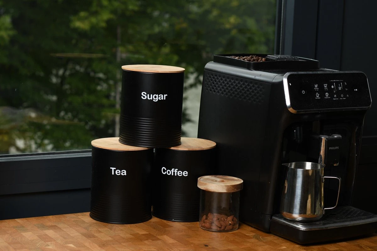 Bewaarblik – Voorraadpotten – Suikerpot – 3 stuks – Voorraadblik – Deksel Bamboe – Luchtdict Voorraadbussen Potten – Koffie Thee Suiker – Zwart