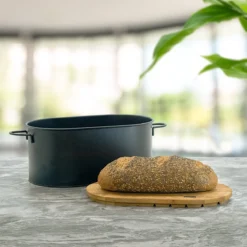 Vers gebakken brood of verse broodjes uit de oven, je bewaart ze luchtdicht in deze elegante broodtrommel. Hou je brood langer vers in deze elegant vormgegeven broodtrommel. Deze broodtrommel biedt ruimte aan een heel brood of meerdere kleine broodjes en de deksel is tegelijkertijd een snijplank. De broodtrommel is verkrijgbaar in zwart en wit.