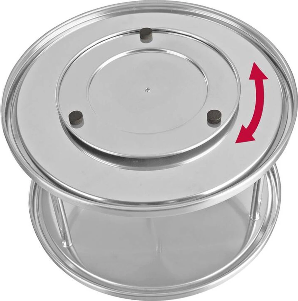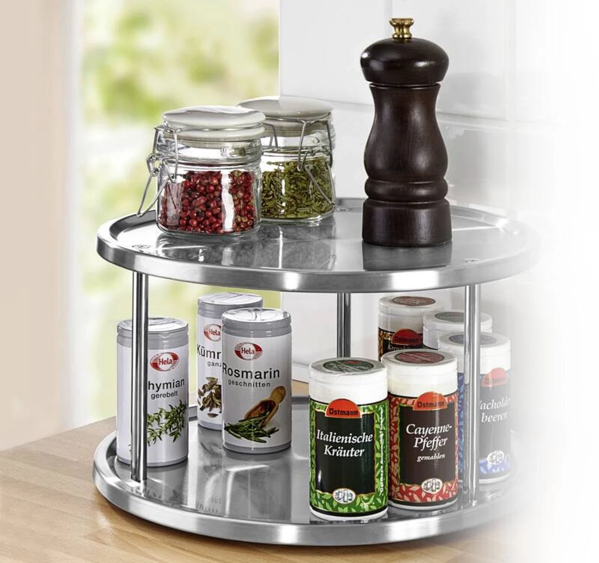 Met zijn elegante uiterlijk slaat de kastrondel niet alleen een goed figuur in de kast maar biedt hij zich ook aan als decoratieve organisatieoplossing voor het werkblad. Vooral hobbykoks zijn dol op de dubbeldekker omdat op de twee schappen veelgebruikte specerijen kruiden oliƫn en azijnen kunnen worden opgeborgen. Lang rommelen in het kruidenrek behoort tot het verleden want zout saffraan of de goede walnootolie zijn altijd binnen handbereik.