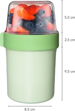 De yoghurtbeker bestaat uit twee losse bakjes die aan elkaar gedraaid kunnen worden tot één geheel met de deksel als tussenschot. Bewaar in het ene bakje bijvoorbeeld de yoghurt en in de andere de muesli zodat het knapperig blijft.