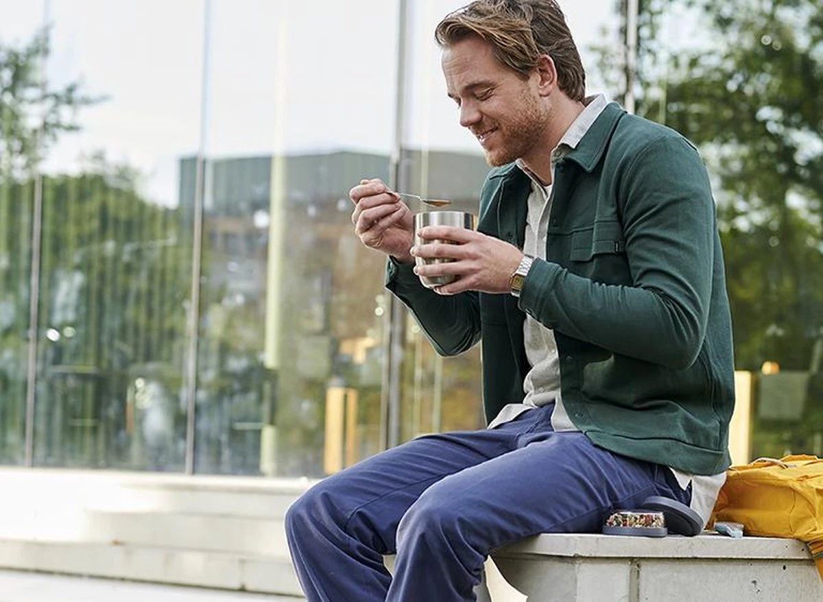 Altijd tijd tekort in de ochtend? Herkenbaar. Neem voor onderweg de isoleer lunchpot Ellipse in Titanium mee met frisse yoghurt en granola (handig, want die blijft lekker knapperig in de deksel!). In de dubbelwandige roestvrij stalen Muesli beker to go blijft je yoghurt lekker koel… zelfs tot de lunch! In de trein of op je werk alleen nog even mixen en… klaar. Avonddienst, school of sportles zonder magnetron op locatie? Geen probleem: warm thuis een soepje op, giet ‘m in de soep beker to go, croutons in de deksel… et voilá, zelfs na een paar uur nog een lekker warme maaltijd! Deze yoghurt beker voor muesli houdt je eten tot 6-8 uur* warm en tot 12 uur koud.