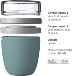 Deze muesli beker to go van Mepal is één handig product om je lunch of tussendoortje mee te nemen, maar heeft twee verschillende compartimenten om de verschillende ingrediënten gescheiden te houden. Bijvoorbeeld de yoghurt en de muesli of fruit zitten in een aparte container, waarbij de deksel van de yoghurtbeker niet de bodem van de mueslicontainer is. Door middel van een eenvoudige draaibeweging scheid je de twee compartimenten om de ingrediënten te mixen. Dé oplossing om geknoei tijdens het mengen te voorkomen. Het is de eerste oplossing die super makkelijk is in het gebruik.