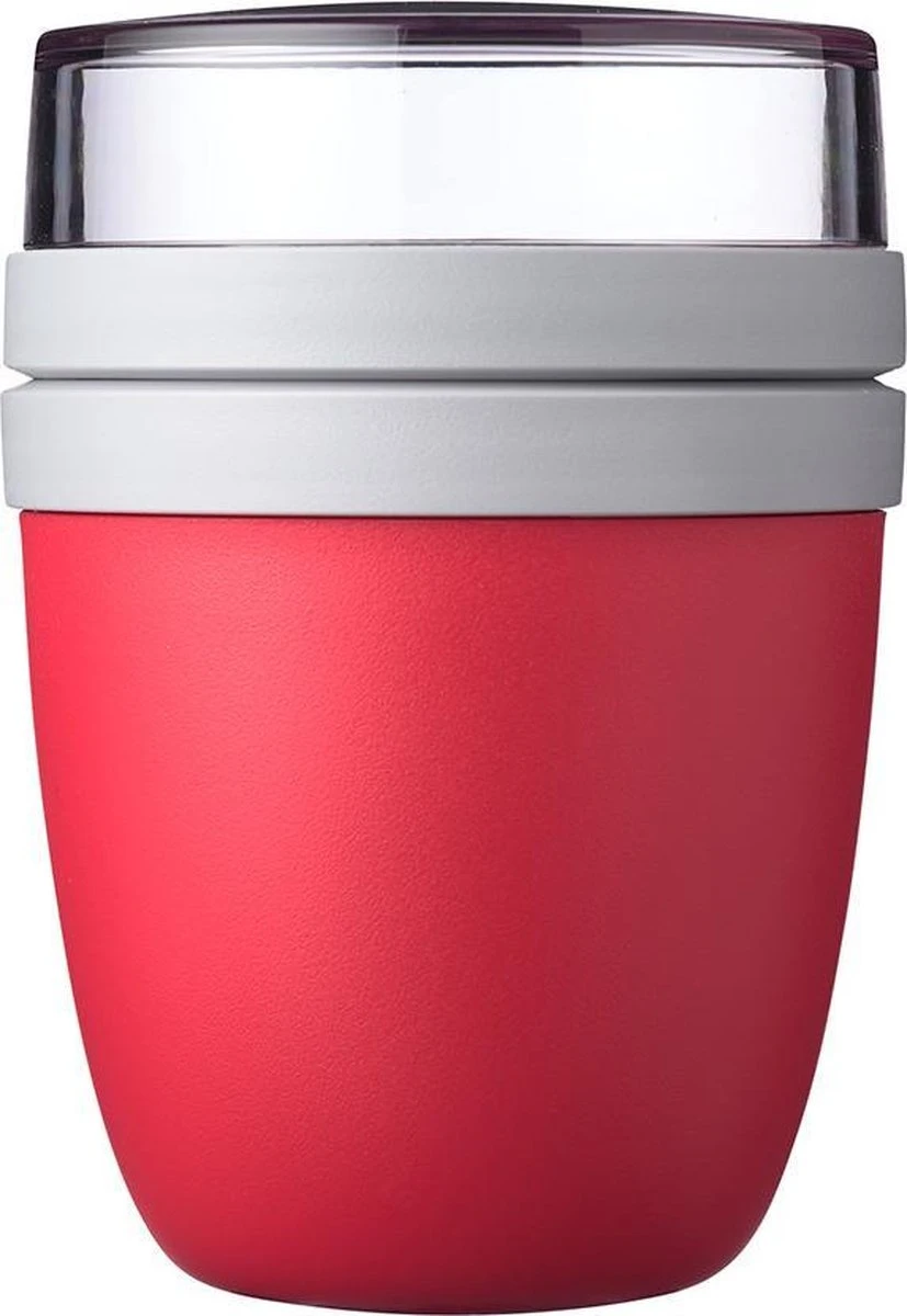 Mepal Lunchpot Ellipse in de kleur Nordic red. Deze rode muesli beker to go van Mepal is één handig product om je lunch of tussendoortje mee te nemen, maar heeft twee verschillende compartimenten om de verschillende ingrediënten gescheiden te houden. Bijvoorbeeld de yoghurt en de muesli of fruit zitten in een aparte container, waarbij de deksel van de yoghurtbeker niet de bodem van de mueslicontainer is. Door middel van een eenvoudige draaibeweging scheid je de twee compartimenten om de ingrediënten te mixen. Dé oplossing om geknoei tijdens het mengen te voorkomen. Het is de eerste oplossing die super makkelijk is in het gebruik.