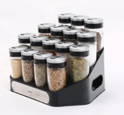 Luxe kruidenrek voor compacte opslag van 16x specerijen / kruiden potjes van glas, voorzien van een strooideksel. In een handige compacte trapsgewijze houder voor: specerijen, kruiden, zout, peper etc. voor gebruik tijdens het koken in uw keuken.