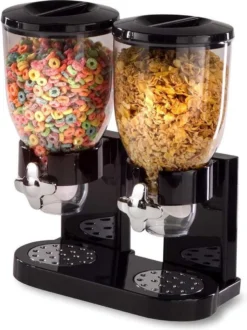 Met deze duo voedsel dispenser haal je luxe en gemak in huis! Een geweldig keukenaccessoire voor ’s ochtends bij het ontbijt. Niet meer na hoeven denken over de hoeveelheid. Houd een kom onder de dispenser, draai aan het wiel en de cornflakes of cruesli komen er perfect gedoseerd uit. Geen half lege pakken meer in de la of losse bussen maar een prachtig item op je keukenblad die niet alleen uiterst handig is maar ook nog eens het luxe gevoel van een heus hotel uitstraalt! De inhoud blijft vers doordat er een deksel op de houders zit.