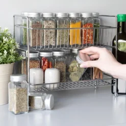- Dit brede rekje biedt genoeg ruimte voor 2 rijen normale kruidenpotjes. Varieer met verschillende groottes en breedtes of gebruik dezelfde kruidenpotjes voor een opgeruimde uitstraling. Ook geschikt voor flesjes olie, azijn, siropen etc.