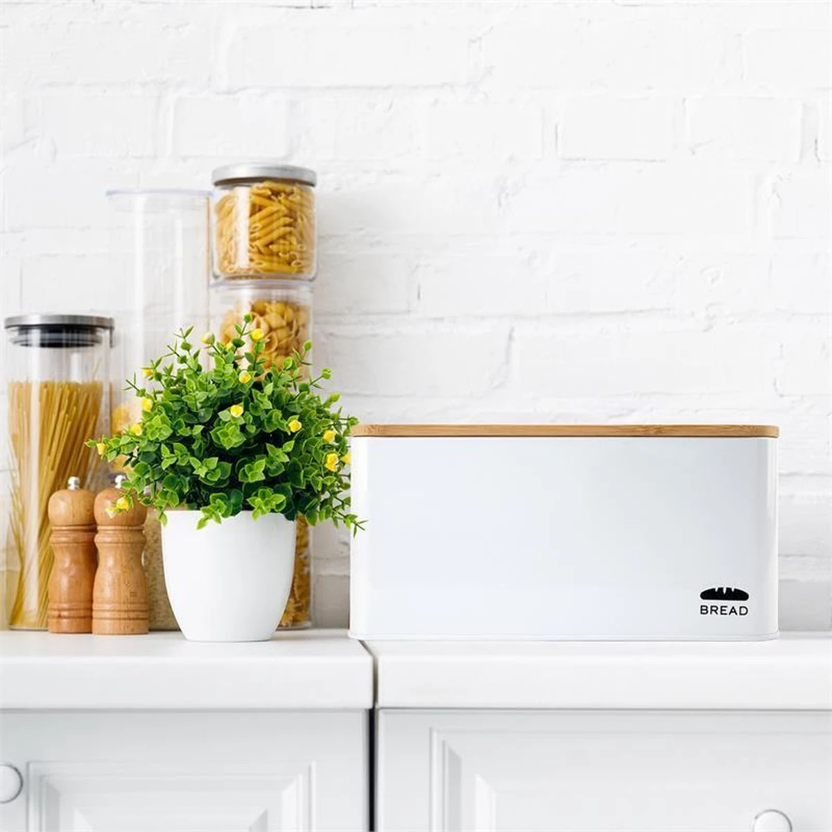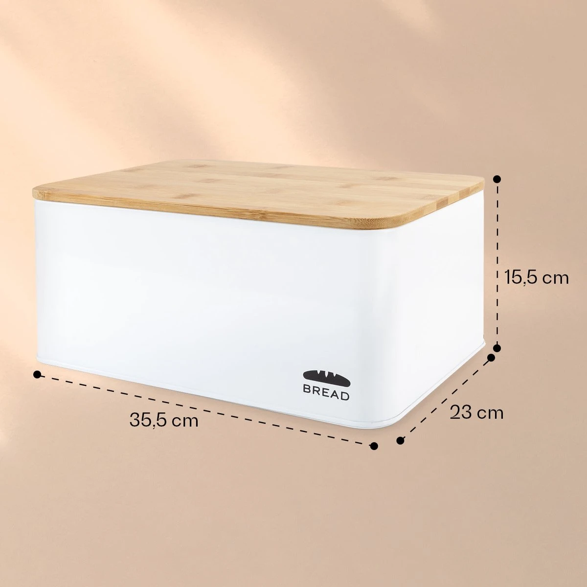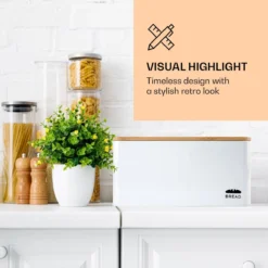 Praktisch en chique! De grote metalen broodtrommel Oklahoma met snijplank in trendy look van Klarstein is niet alleen zeer stevig en groot genoeg om meerdere broden en bakwaren tegelijk in op te bergen, maar ook een absolute blikvanger in de keuken. Dankzij de ventilatiegaten aan de achterkant van de broodtrommel is de belangrijke luchtcirculatie gewaarborgd. Dit vermindert het vocht binnenin en houdt uw brood lang knapperig en vers! Het praktische en robuuste bamboe deksel kan ook als snijplank worden gebruikt. Met afmetingen van 35,5 x 15,5 x 23 cm (BxHxD), past deze broodopberger comfortabel op uw dressoir, aanrecht of in de ruime keukenkast.