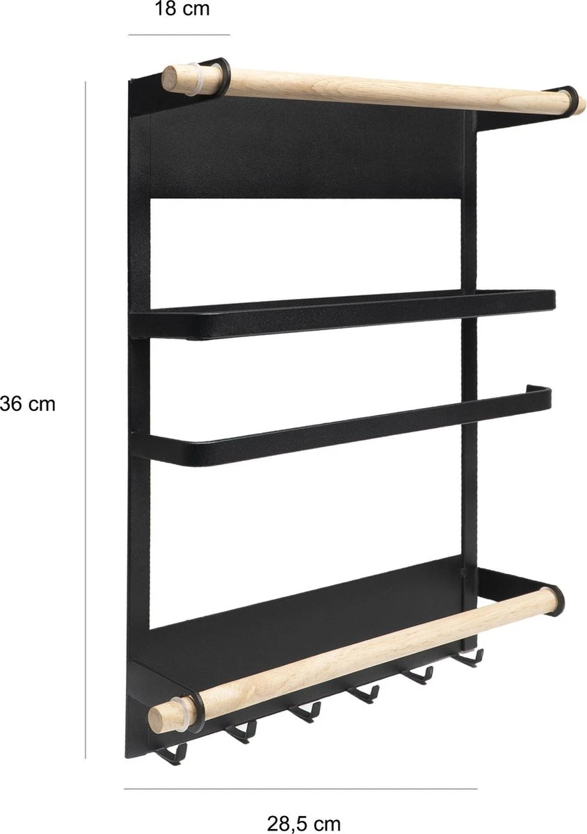 Het keukenrek in het zwart met magneetstrip is 35 cm hoog, 28.5 cm breed en 7,5 cm diep. Het plateau waar potjes opgezet kunnen worden meet 5,5 x 24 cm (lxb). Hij past daardoor op (bijna) elke koelkast,maar is natuurlijk ook te bevestigen aan alle magnetische oppervlakten. Bovenaan het rekje is een houten stang om wat aan te hangen of bijvoorbeeld een bord achter te zetten. Dat bord kan dan ondersteund worden door het metalen plankje eronder. Onder het plankje bevind zich een metalen stang,met een opening aan de zijkant. Vervolgens is er weer een houten stang. Helemaal onderaan zijn ook nog een aantal metalen haakjes te vinden,hier kunnen handdoeken aan opgehangen worden.