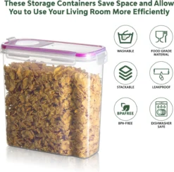 GEEN muffe granen meer : Veel mensen kiezen voor ontbijtgranen bij het ontbijt. Zodra de ontbijtgranenverpakking word geopend verdwijnt de knapperige heerlijkheid van de ontbijtgranen. Door de 4 zijdelings vergrendelbare deksels met siliconen afdichting zorgt dit product ervoor dat er geen lucht of water binnenkomt, waardoor uw ontbijtgranen supervers blijven.