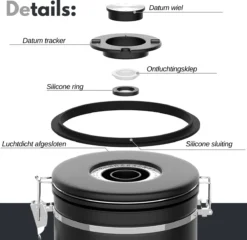 Door de CO2 uitlaatventiel worden koffiebonen ontgast zonder dat er lucht in de bus terecht komt. Hierdoor kun je de koffie ruiken zonder dat dit ten kost gaat van de versheid van de bonen. Verder is de koffiebus voorzien van een aanpasbare datumtracker waarmee je de houdbaarheidsdatum van je voedsel in de gaten kan houden.